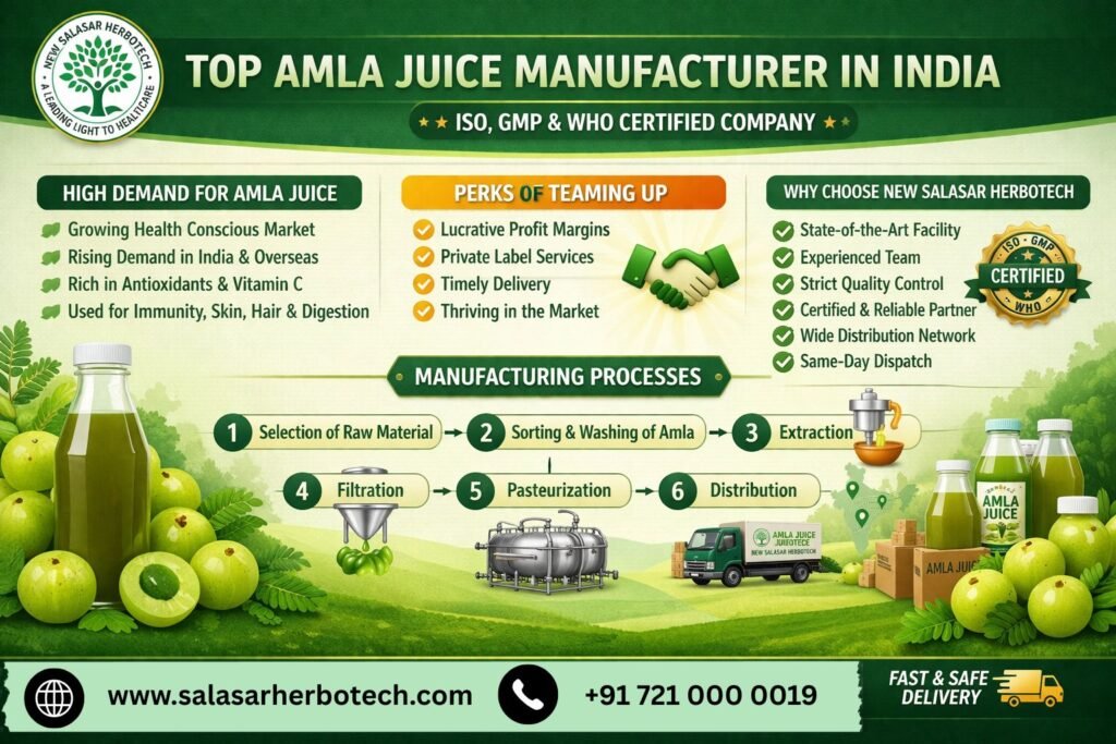 Amla juice packs a punch with vitamins and nutrients that give your body a fighting chance against a bunch of health issues. Amla juice is super popular in the Indian market for all sorts of reasons. The report indicates that Amla Juice sales have surged by half across the country. So, basically, most stores, big-time suppliers, business people, and pharma companies need to stock up on top-notch Amla Juice right away. New Salasar Herbotech stands out as an amla juice manufacturer in India, with operations spread across the country. The company is a leading producer, exporter, and distributor of top-notch amla juice, packed with high biological value, nutrients, and vitamins, and it’s also budget-friendly. They’re seen as the leading Third Party Amla Juice Manufacturers India, committed to offering quality products at great value for their customers and patients.